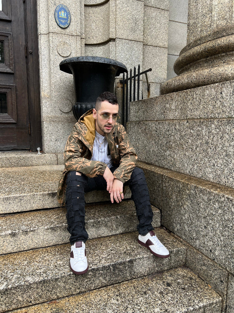 THE STORY: The prototype for the Lattice Denim. This sample was assembled from two pairs of black denim, cut into strips vertically and horizontally, then each strip was painstakingly hand-sewn. Even the back patches were cut, woven, then hand embroidered. Because of the construction they must be put on with a little care, similar to heavily distressed jeans.